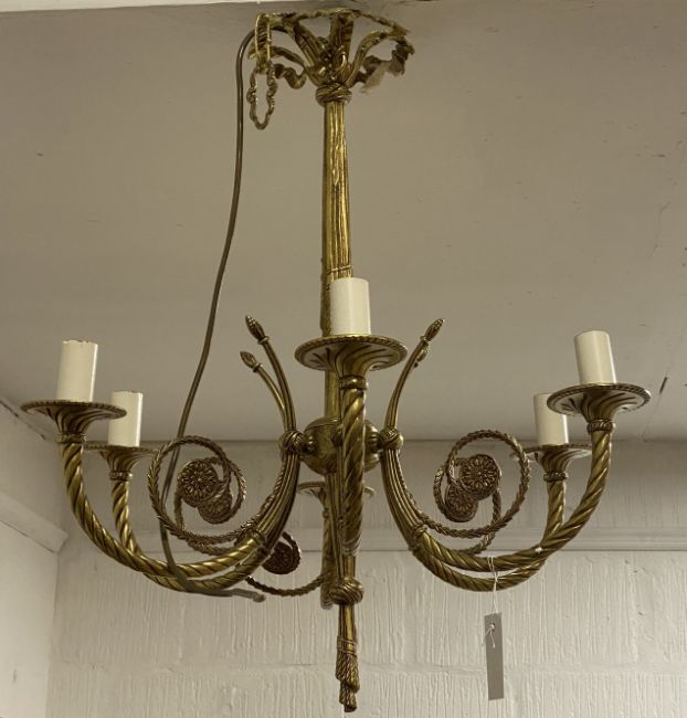 A well cast gilt brass chandelier, mid 20th century, the central column issuing six rope twist and 'C' scrolled branches. H66cm.