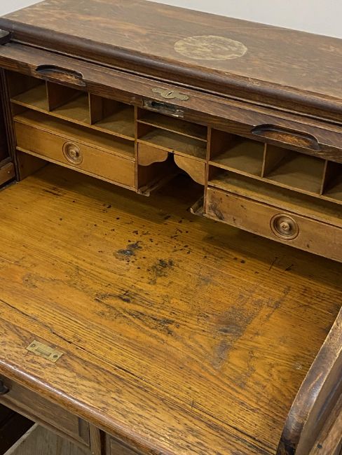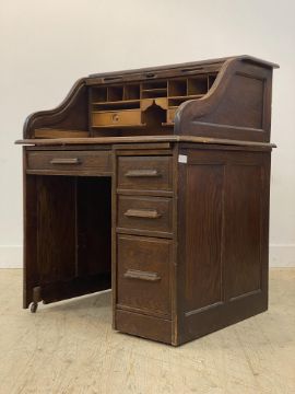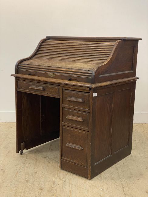 An Edwardian oak single pedestal roll top desk, the serpentine tambour top opening to a fitted interior, and the escutcheon inscribed 'Angus London & Glasgow' above one long and three short drawers, moving on castors. H113cm, W93cm, D78cm.