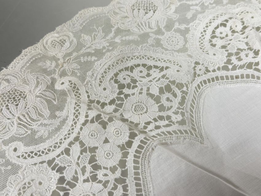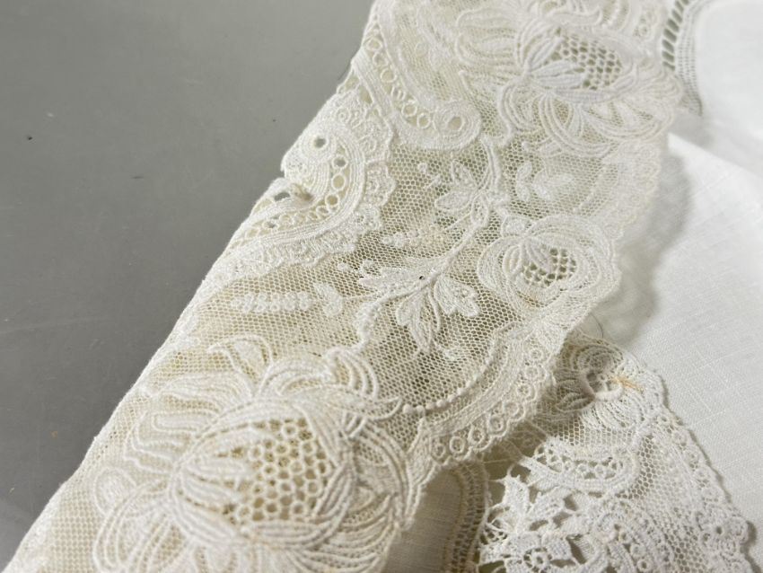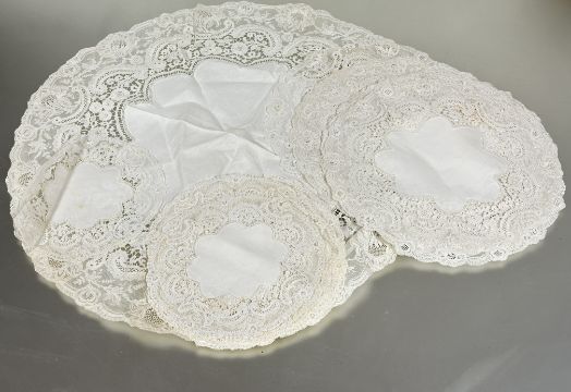 A Edwardian Brussels lace bordered table linen set comprising table center piece D x 53cm set of eleven dinner plate coasters D x 26cm and twelve wince glass coasters D x 16cm  some slight staining (a lot)