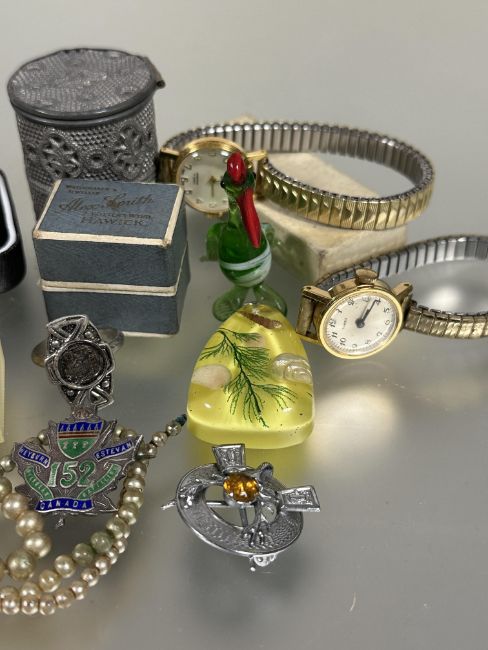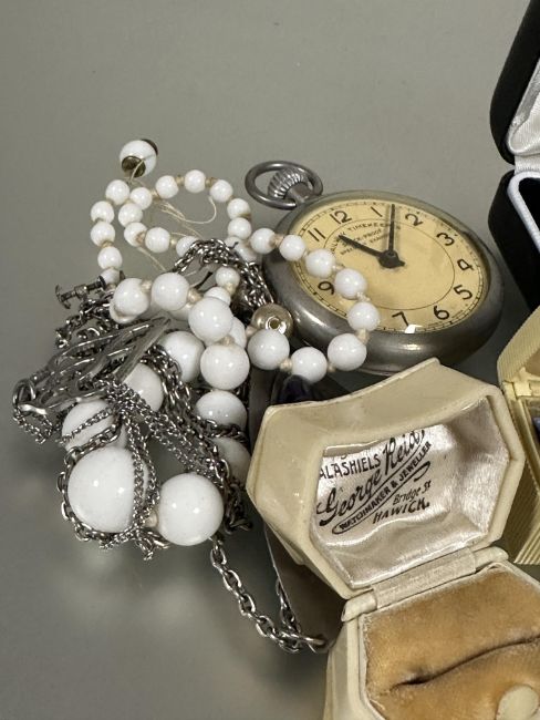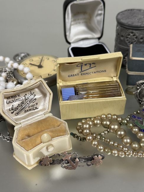 A collection of costume jewellery to include a Railway timekeepers stop watch, two ladys wrist watches, silver brooches, bead necklaces, pendants, vintage boxes and a Goya Great Expectations miniature scent bottle with original plastic case  (a lot)