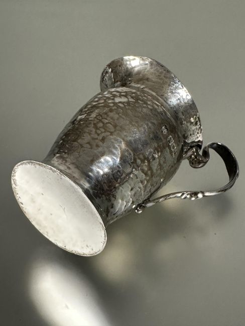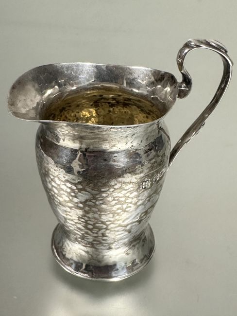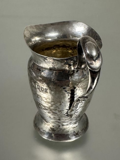 A Edwardian Art and Crafts London silver individual milk jug with planished finish and C scroll handle to side  no signs of hard solder or repairs H x 7cm  D x 4.5cm London 1908 50.7g