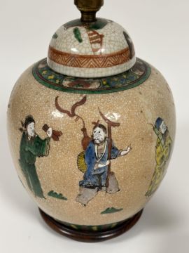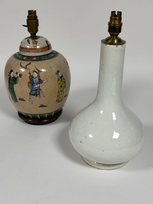 Property of the late Countess Haig, a Spanish pottery slim neck baluster vase lamp with white glaze H x 33cm and a modern Chinese craquelure ginger jar and cover lamp decorated with enamel figures mounted on hardwood circular base H x 28cm (2)