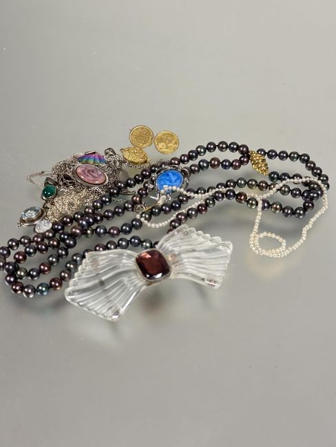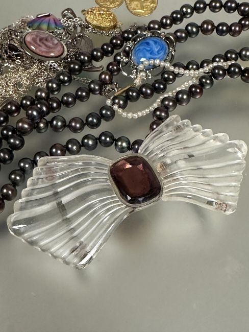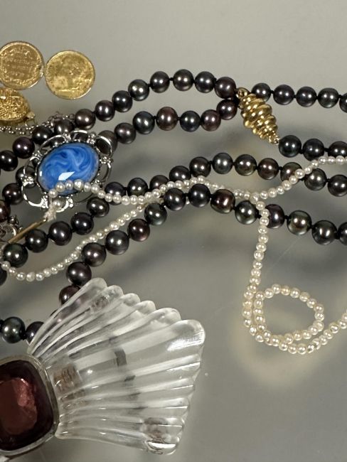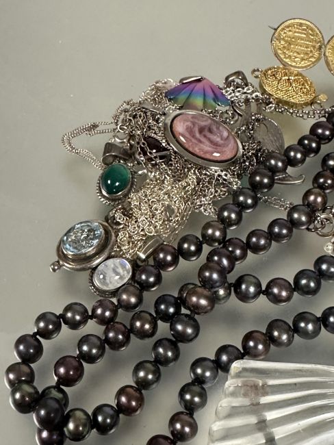 A collection of costume jewellery including an amethyst glass Lalique style Art Deco belt buckle L x 9cm , a childs coming of age seed pearl necklace with 9ct gold barrel clasp fastening 17cm, a black and grey cultured pearl necklace with magnetic clasp fastening L x41cm, coin brooch etc (a lot)