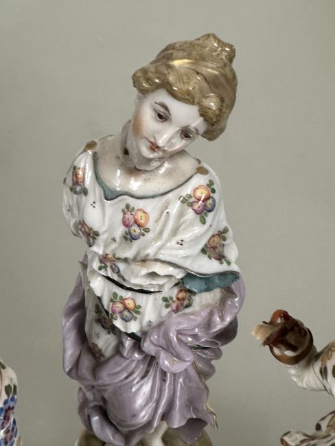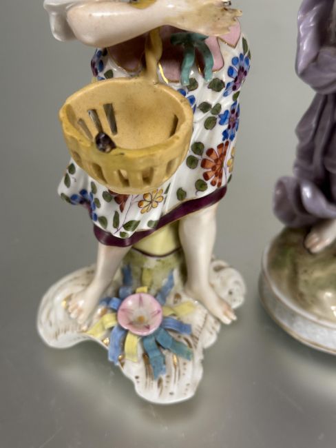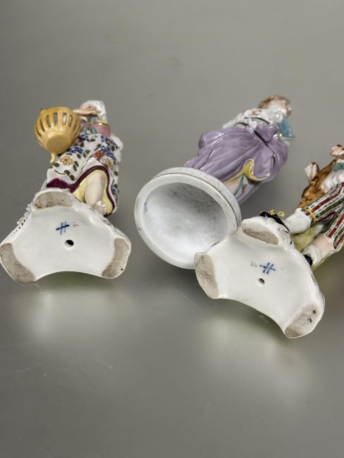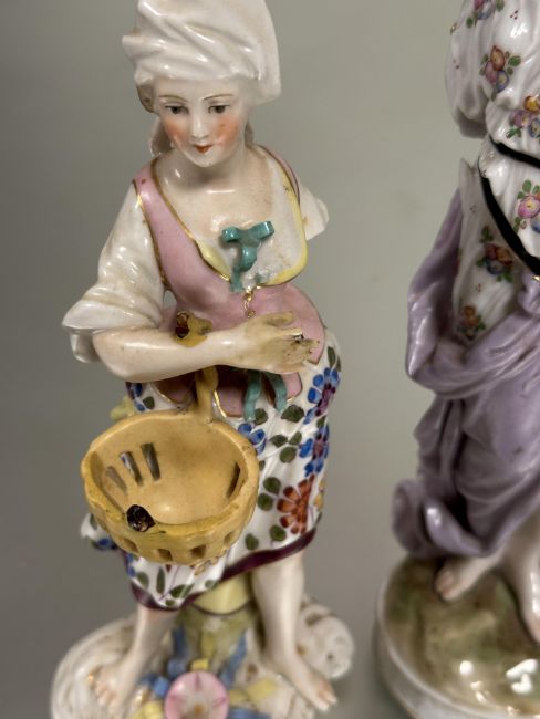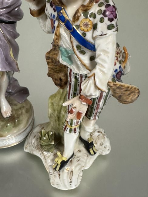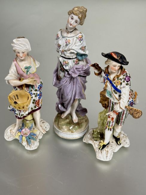 Property of the late Countess Haig, a pair of late 19thc the porcelain standing figures of the farmer and companion  with a basket losses to fingers, arm, toes etc and a Meissen style figure missing arms a/f (3)