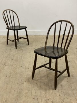 A pair of Vintage side chairs, each with hoop and spindle back over saddle seat, raised on turned supports. H80cm.