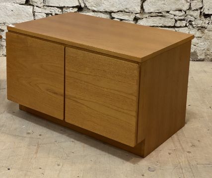 A mid century teak low cabinet, fitted with two doors opening to a division behind. H52cm, W85cm, D55cm.