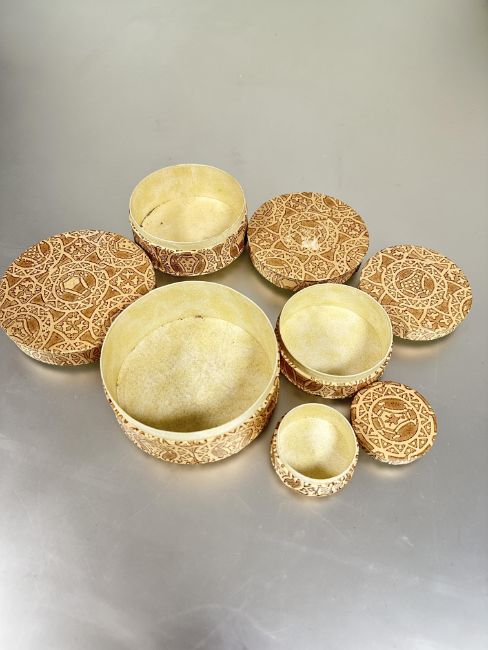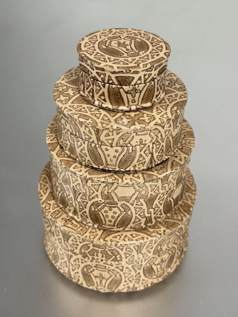 Property of the late Countess Haig, a graduated set of four circular Italian hand made paper boxes smallest D x 5.5cm largest D x 12cm (4)