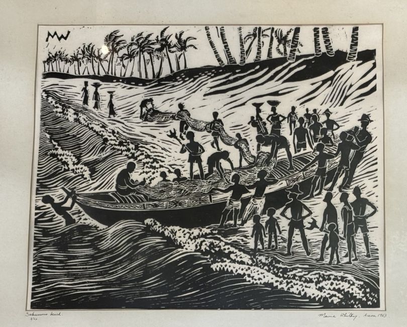 Marie Whitby Sakumono Beach, lino print, signed, titled and dated 1963 bellow, framed. (39cmx47cm)