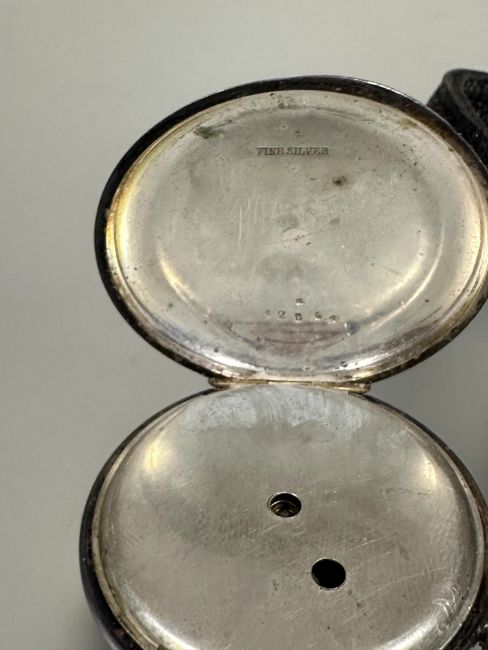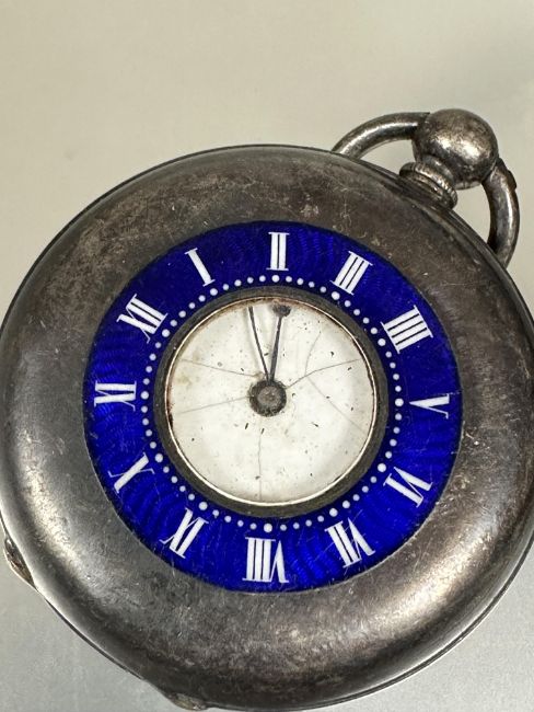 A Edwardian ladys silver half hunter fob watch with blue enamel outer ring to case with roman numerals and inner enamel dial a/f and leather guard lobster claw and t bar D x 4cm