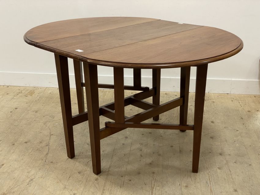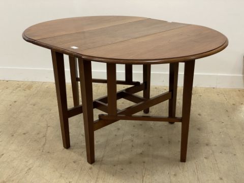 A mahogany drop leaf dining table, the oval top raised on square tapered swing supports. H79cm, W112cm, L150cm. (extended)