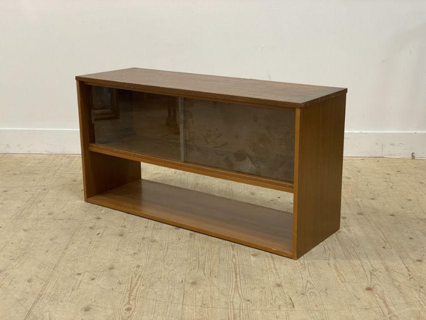 A mid century teak veneered side cabinet, fitted with two sliding glass doors. H57cm, W107cm, D33cm.