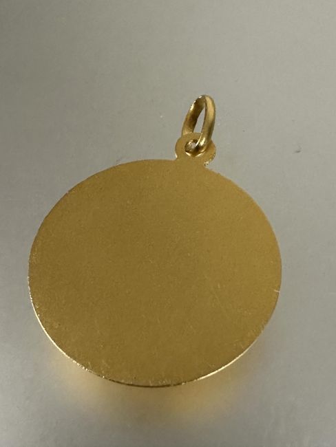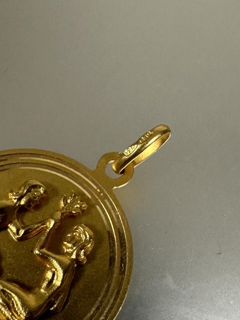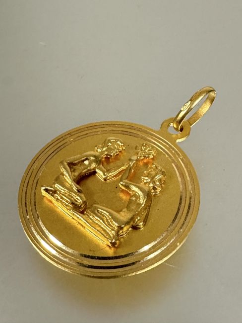 A 18ct gold circular pendant with two kneeling figures holding an olive branch with chain loop to top D x 2.8cm 10.11g