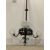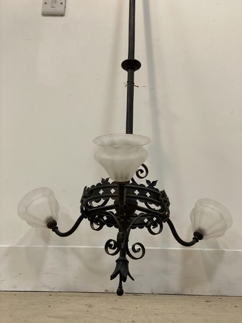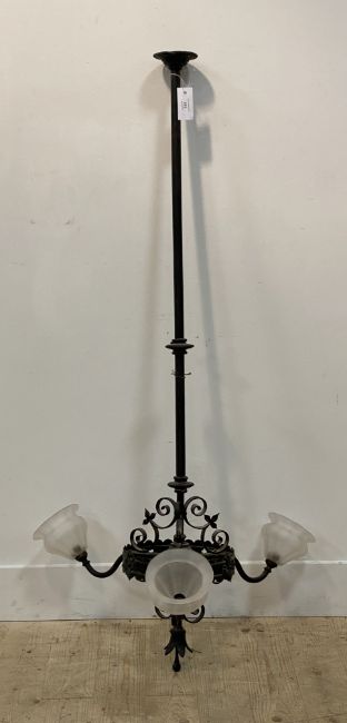 An early 20th century wrought iron electrolier ceiling light fitting, the column with pierced metal bracket having floral bosses and issuing 'S' scrolls and three branches, each having a moulded glass shade. H140cm.