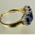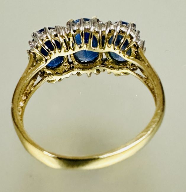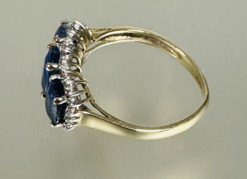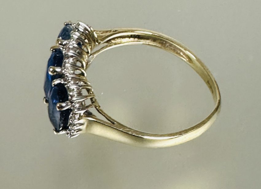 A 9ct gold graduated gem set ring center stone approximately 0.7ct mounted in four claw setting with 22 diamond pint set border O 3.05g