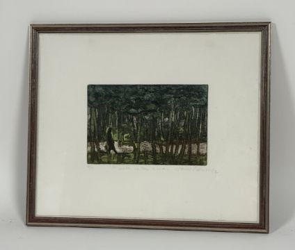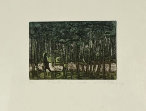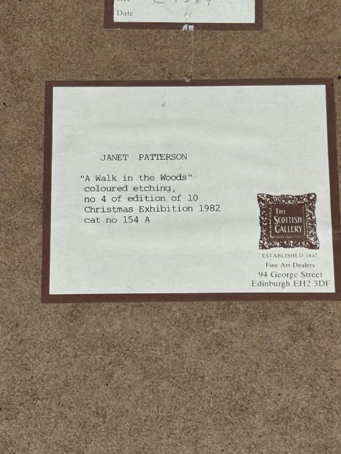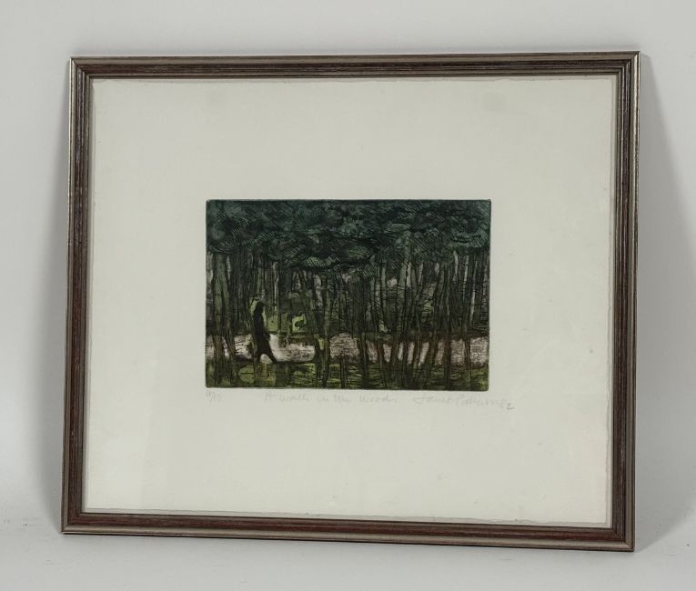 Property of the late Countess Haig: Janet Patterson (Scottish, b. 1941), A Walk in the Woods, coloured etching, signed and titled in pencil, dated (19)82 and ed. 4/10, framed. Plate 13.25cm by 20.5cm. Provenance: The Scottish Gallery, Edinburgh, Christmas Exhibition 1982 (label verso). Note: this lot may be subject to ARR.