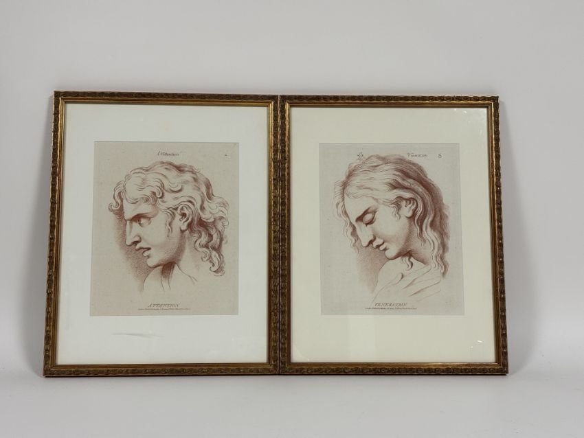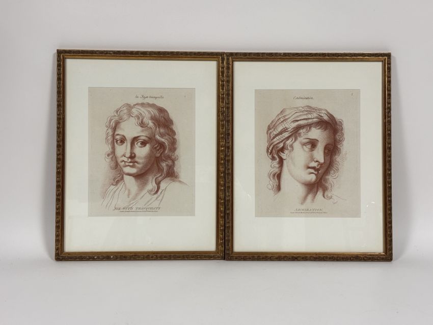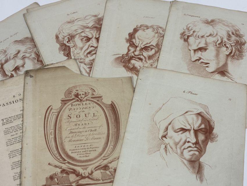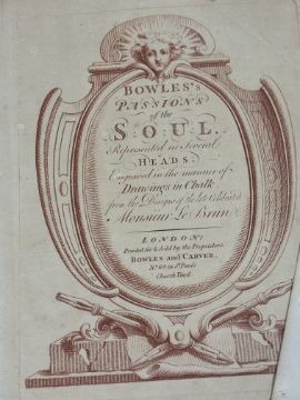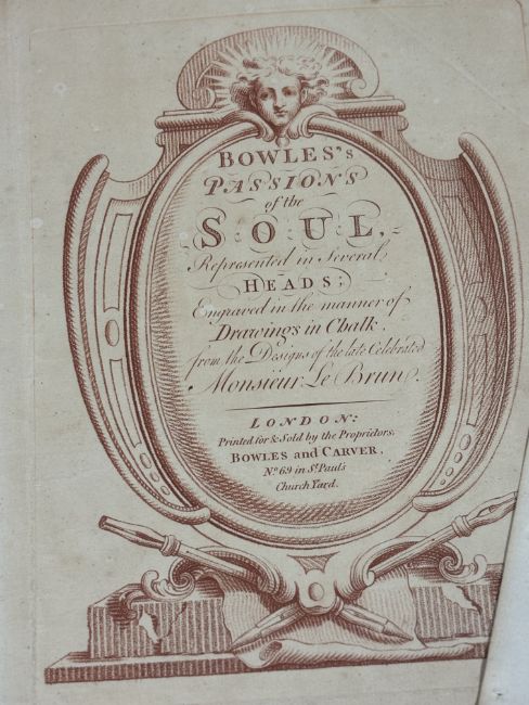 After Charles Le Brun (1616-1690), Bowles's Passions of the Soul, a group of fifteen sanguine/sepia soft-ground etched plates, four framed and eleven unframed, "Engraved in the manner of Drawings in Chalk from the Designs of the late Celebrated Monsieur Le Brun", pub. London by Bowles and Carver, c. 1785 (the unframed examples within loose marbled covers and with frontspiece) (15) Each plate c. 25cm by 19cm