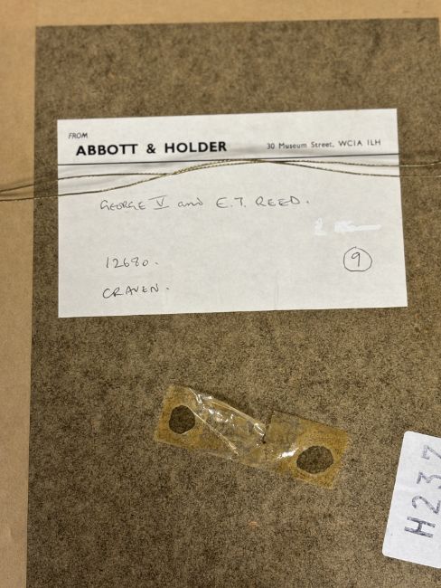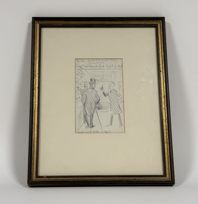 Edward Tennyson Reed (British, 1860-1933), "Geo. Rex - Send that to Buckingham Palace - it's damned good", caricature showing George V in Edward Tennyson Reed's gallery with the artist, further inscribed "E.T.R. - and damned cheap by gad sir, what!" and in ink at the bottom of the sheet "made over to ETR by GLG", pencil, framed. 15.5cm by 10cm. Provenance: with Abbott & Holder, 30 Museum Street, London (label verso).