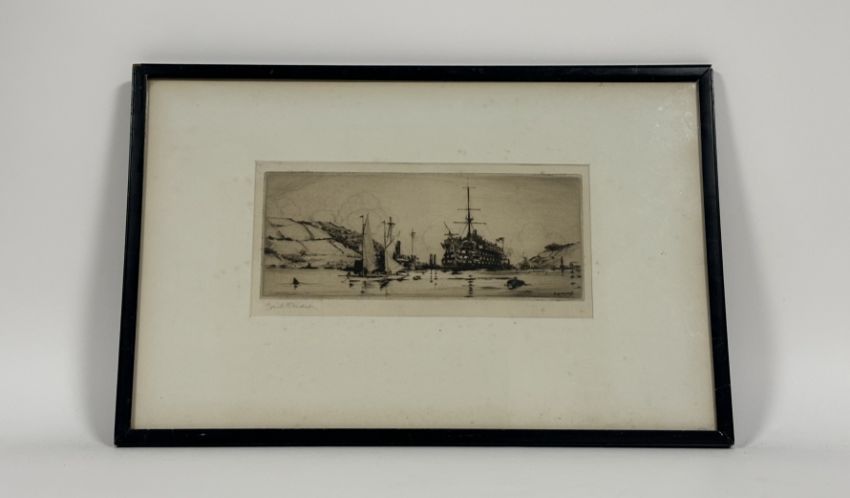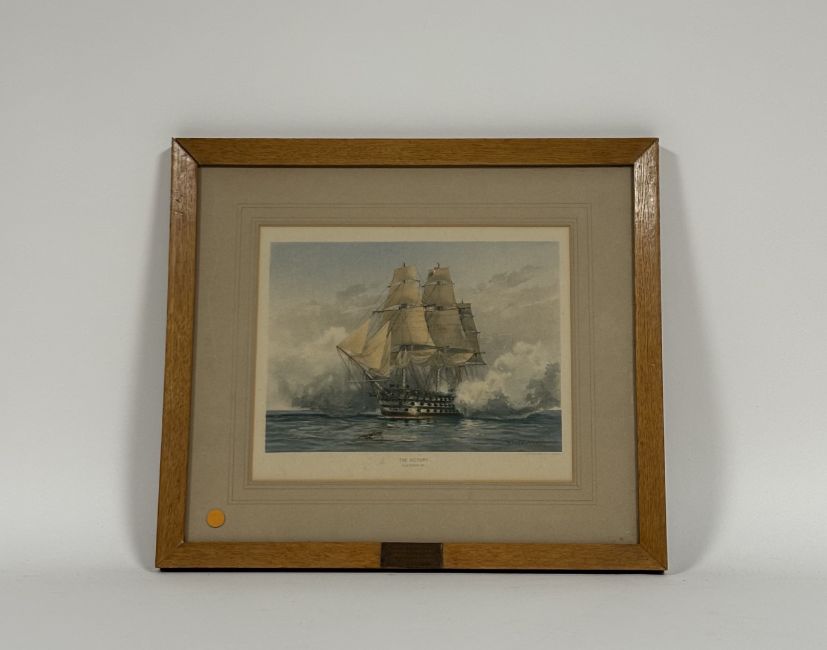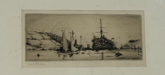 After William Frederick Mitchell (British, 1845-1914) "HMS Victory", coloured print in an oak frame with copper plaque inscribed "Made with the Original Timber and Copper Sheathing of H.M.S. Victory"; together with Frank Henry Mason (British, 1876-1965), H.M.S. Britannia at Dartmouth, etching, signed in pencil, framed. (2) 19.5cm by 24cm and 11cm by 27.5cm (plate).