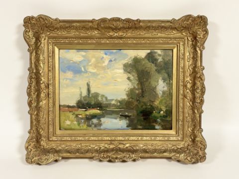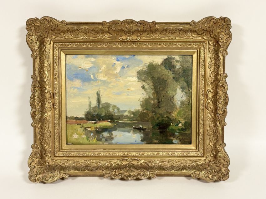 William Miller Frazer R.S.A. (Scottish, 1864-1961), "Near Thrapston, Northants.", signed lower right, oil on board, titled in pencil verso, in a gilt-composition frame. 24cm by 34cm. Note: this lot may be subject to ARR.