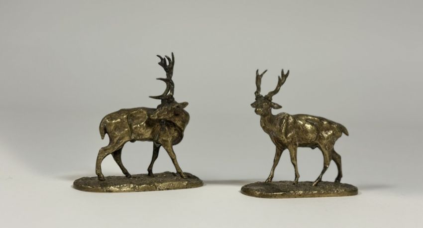 After Pierre-Jules Mene (French 1810-79), a pair of miniature or desk bronze models of stags, Cerf Tournee and Cerf Debout, 19th century, each on an integral oval base and signed "P.J. Mene". Heights 8cm and 7.5cm (2)