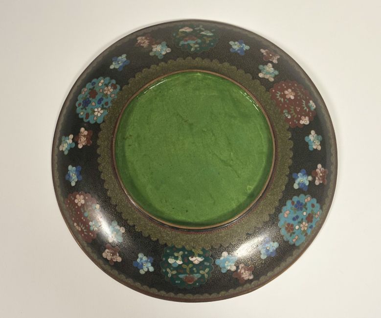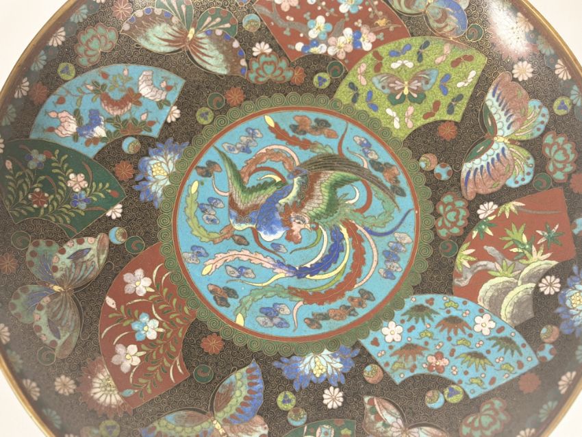A Japanese cloisonne enamel dish in kyotojippo style, Meiji period, the central roundel depicting a ho-ho bird on a blue ground, the border characteristically decorated with gilt scrolls, butterflies, Buddhistic mons and panels of floral sprays. Diameter 30.5cm