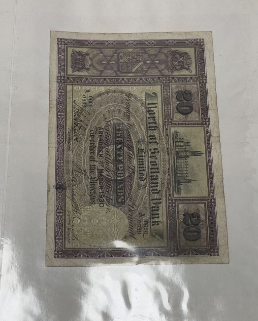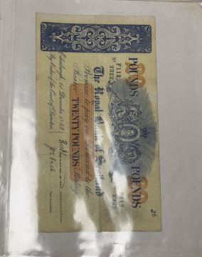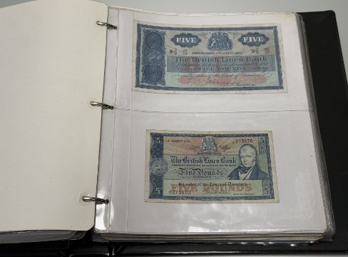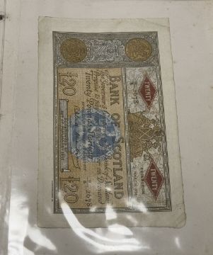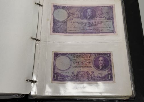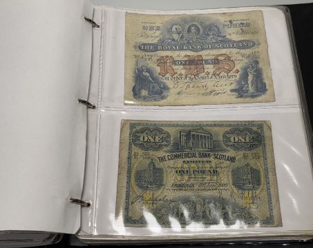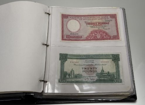 A folio containing a collection of sixty Scottish and English banknotes to include a Royal Bank of Scotland £20 note 1952 F11112 2322, a Bank of Scotland £20 note 1958, 10/B 2678, a North of Scotland Bank Limited £20 note 1930 A 0086 0339, a national Commercial bank of Scoland Limited £20 note 1959, a Clydesdale & North of Scotland Bank Liomited £20 note 1962, a Bank of Scotland £20 note 1958 9/B 2140, a Bank of England £10 note B63 878216 in unused condition, a National Commercail Bank of Scotland Limited £5 note 1961, The National Bank of Scotland £5 note 1953 C982-231, a Bank of England £5 note 1950 R55 031249, a Bank of England £5 note 1944 E66 072709, a Royal Bank of Scotland £5 note 1949 F3171 4186, The Royal Bank of Scotland £1 not 1924 J 405 252, a Commercail Bank of Scotland Limited £1 note 1920, an Ulster Bank Limited £5 note George best in presentatuion slip case GB 370777 mint condition, a Royal Bank of Scotland £5 note Jack Nicklaus 2005 JWN139072 folded etc ( a lot)