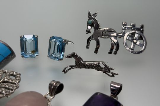 A collection of silver jewellery to include a oval rose quartz pendant: l. x 4.5cm, a turquoise set pendant: l. x 3.5cm, a Mexican silver donkey and cart turquoise brooch: l. x 5cm, a black onyx pendant: l. x 3.5cm. a pair of silver clip on aquamarine coloured cushion cut earrings: l. x 2.7cm, an Irish silver marcasite horse brooch set red stone eye: l. x 4cm, an Edwardian silver crescent brooch: l. x 2.5cm and a white metal Art Deco style paste set two part buckle: l. x 7.5cm 63.7g (a lot)