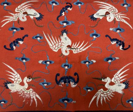 A Chinese late 19thc hanging textile / door pelmet on red textile ground, with various silk threaded decorated with a floral border with cranes and bats motif central panel / flap.