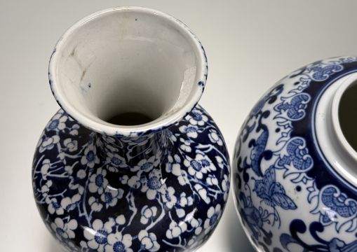 A pair of Wood & Sons blue and white prunus pattern vases (h-27cm) together with a blue and white scrolling floral and butterflies pattern ginger jar (h-20.5cm). (3)