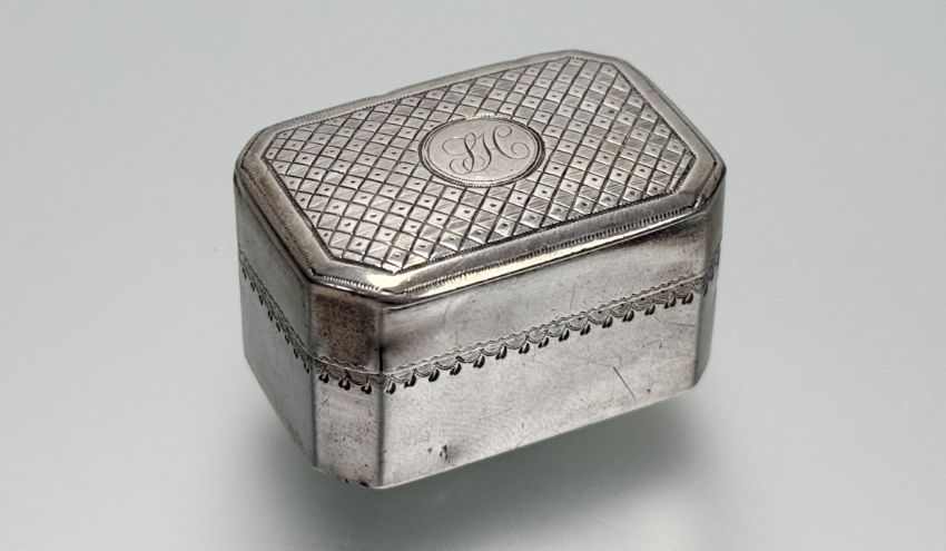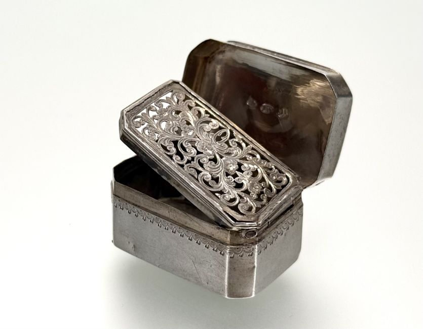 A George III silver vinaigrette, Thomas Willmore, Birmingham 1800, oblong, with cut-off corners, the cover engraved with a trellis pattern, opening to a hinged grille. Length 4cm, 1 troy ounce