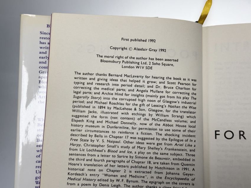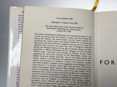 Alasdair Gray, Poor Things, signed first edition, Bloomsbury 1992, hardback with dustcover, inscribed "To Maggie from Alasdair". Note: Maggie is Maggie Havergal, wife of well-known Scottish journalist, Bob Cuddihy (1946-2024).