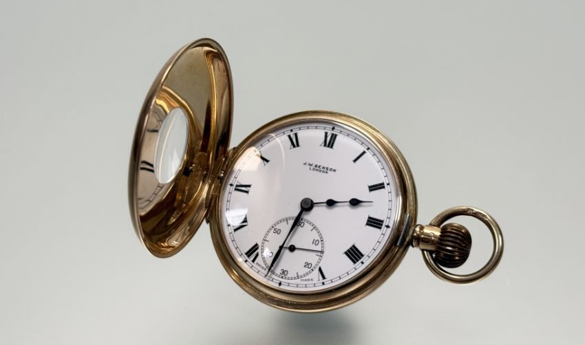 A George V 9ct gold half hunter pocket watch, the case hallmarked for Birmingham 1929, Benson London keyless wind movement, with signed white enamel dial and a 9ct dust cover. Diameter of dial 41mm, gross weight 95 grams.