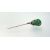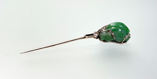 An Art Deco diamond and onyx mounted carved jade jabot pin, the jade modelled as a bud set with arrangements of diamond points in leaves and tendrils, above a collet-set round brilliant-cut diamond (c. 0.20ct), all in white metal with a jade and diamond terminal, unmarked. Length 82mm.